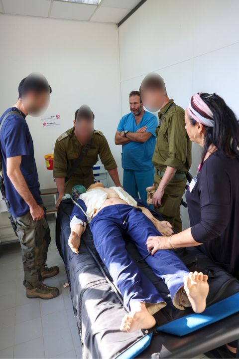 בתמונה: ד"ר שחר גרונר והצוות הרפואי הצבאי מתרגל על בובה חכמה ברמב"ם צילום: הקריה הרפואית רמב"ם.